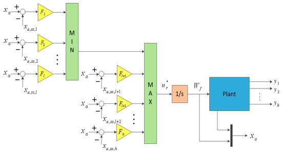It should be noted that when a min-max control selection structure is employed, its regulator will take over and attempt to drive the output to the prescribed limit, if one auxiliary output approaches its limit. The multi-regulator scheme with integral control and min-max selectors is shown in Figure 1. The regulators provide control input rates. Let and . stands for the steady state when the output tracks , where . Thus, the min-max selection law is expressed as: