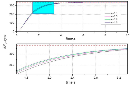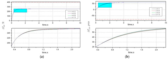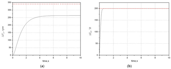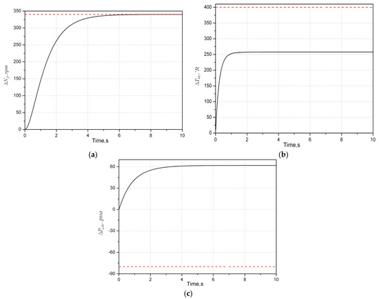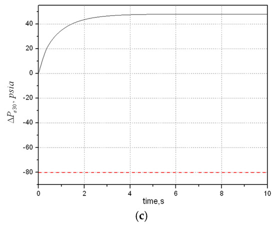 First, we will check whether transient limit preservation is achieved. The incremental limits are: and . The former is to prevent aircraft engines from overheating, which is higher-limited; the latter is to prevent lean blowout conditions in the combustor, which is lower limited. Assume that the tracking target is and the initial state is . By calculation, it is known that the invariant zero of system is at −4.4851. Solve Equation (17) for the vector . Both the weighting matrices and are all constant, which equal to 0.01 due to . Then use genetic algorithm to design an optimal augmented monotonic tracking controller (OAMTC) controller and the solution is: