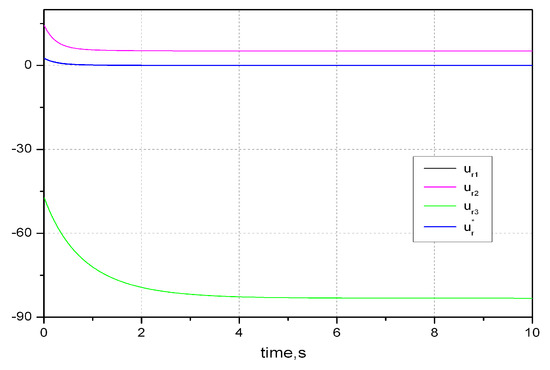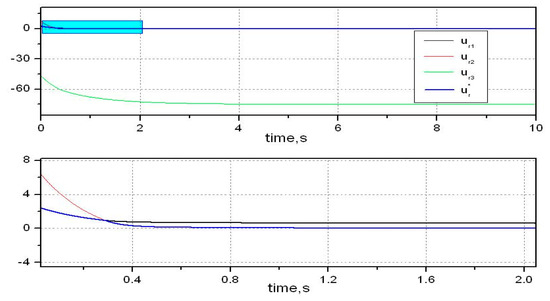 The steady state for is . Now, assume that the tracking target is , then the invariant zeros of system of is at −2.3347 and −1.0211. Also, assume that , the invariant zeros of system of is at −1.7914 and −5.1244. Because there are two invariant zeros in system and , respectively, only one pole needs to be placed and the other are placed at two invariant zeros. It brings a benefit that both main outputs and auxiliary outputs are composed of only one mode, which will keep them monotonic. We solve Equation (17) for the vector , and let two poles be placed at −15 for and , the gain matrices is: