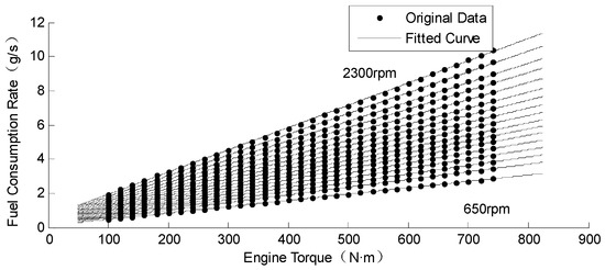 According to the engine fuel consumption data, the relationship between fuel consumption rate and torque under different rotating speed is curve-fitted using the least squares method and is plotted in Figure 2. In Equation (4), and are the fitting coefficients in linear expression (see Appendix A).