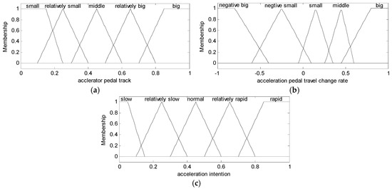 (a) Membership functions of acceleration pedal travel; (b) membership functions of rate of change of acceleration pedal travel; and (c) membership functions of acceleration intention.