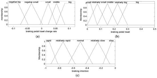 (a) Membership functions of braking pedal travel; (b) membership functions of rate of change of braking pedal travel; and (c) membership functions of braking intention.