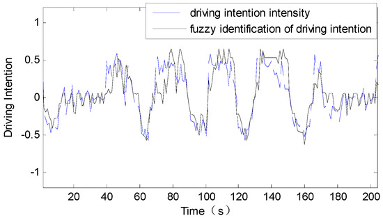 In this paper, the United Kingdom Bus (UKBUS) driving cycle is considered as an example, and the driving intention identification is carried out. Figure 6 shows the speed segment of UKBUS driving cycle. The acceleration intention identification results are in the range of 0–1, the closer that this value is to 1, the more urgent the acceleration intention is. The braking intention identification results are in the range of −1–0, the closer that this value is to −1, the more urgent the braking intention is. Besides, the driving intention is identified as coasting when there are no operations on both accelerator pedal and braking pedal. The resultant values are a continuous time sequence ranging from −1 to 1, based on which the driving intention can be distinguished between acceleration or braking at each and every moment, as well as the urgency of the driving intention. Then the obtained driving intention time sequence, as well as the vehicle speed time sequence, are given as inputs to the NAR neural network. The acceleration calculated through the real velocity is normalized in −1–1 and it is used as the real driving intention intensity. The comparison of the driving intention identified by fuzzy inference and the real driving intention intensity is shown in Figure 7. The mean absolute error (MAE) of the driving intention recognition result is 0.16 when the data ranges from −1 to 1. This fuzzy recognition result with sufficient accuracy could be used as input for the speed prediction neural network to improve the prediction precision.