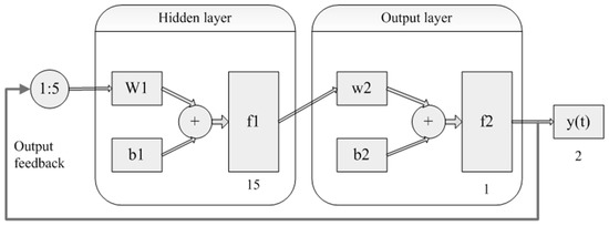 The NAR neural network structure, consisting a hidden layer, an output layer, and an output feedback layer, is given in Figure 8. As shown in Figure 8, the hidden and the output layer include 15 and 1 neurons respectively. The order of output memory is 5. is the connection weight between input and output layer neuron, is the threshold of the layer, is the transfer function of the hidden layer, is the connection weight between hidden layer and output layer, is the threshold of output layer and is the transfer function of output layer.