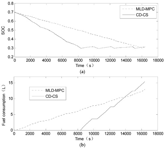 The type of motor is AC induction motor, with rated power of 124 kW, and maximum motor speed of 10,000 r/min. The type of battery used is a lithium battery with a rated capacity of 90 . Mm is 272 N·m, and Min is 1170 N·m. Fitting coefficients of engine and motor are listed in the Appendix A. ADVISOR (Advanced Vehicle Simulator, 2002, National Renewable Energy Laboratory, Golden, CO, USA) is used to simulate the UKBUS driving cycle as shown in Figure 11, with an initial SOC value of 0.7 (), prediction horizon N of 15 s and sampling period of 1 s (the effect of predict time domain is discussed in Section 5.2). The simulation results are presented in Figure 12. Figure 12a is the comparison of the SOC curves between the MLD-MPC control strategy proposed in this paper and Charge Depleting-Charge Sustaining (CD-CS) control strategy. As can be observed, the CD-CS strategy consumes the battery energy within 8000 s, and then sustains SOC around 0.3 for the remainder of the trip. In the MLD-MPC control strategy, the battery energy is completely consumed by the end of the trip. Compared to CD-CS control strategy, the proposed MLD-MPC strategy can make more reasonable use of battery energy. Figure 12b is the comparison of the fuel consumption between the MLD-MPC control strategy presented in this paper and CD-CS control strategy. As seen in the picture, the CD-CS control strategy makes full use of battery energy and does not consume fuel within the first 8000 s, then the fuel consumption grow rapidly during the Charge-Sustaining mode, while the MLD-MPC control strategy maintains a relatively slow fuel consumption rate. Up to the end of the whole driving cycle, the fuel consumption is 12.93 L, and the end value of SOC is 0.3043 for the MLD-MPC control strategy, while the fuel consumption is 15.39 L, and the end value of SOC is 0.3125 for the CD-CS control strategy. It can be concluded from this results that under the same driving cycle conditions, the MLD-MPC control strategy reduces the fuel consumption of a PHEV. Figure 13 shows the comparison of engine operation points of these two control strategies. As can be observed, the engine operation points of the CD-CS control strategy spread out on a much larger area, and a lot of operation points in the low efficiency area. While the engine operation points of MLD-MPC control strategy is relatively centralized and most of them are in the high efficiency area which will improve fuel economic.