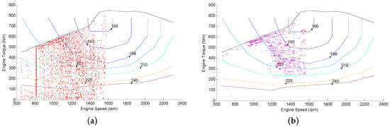 (a) Engine operation points of charge depleting-charge sustaining (CD-CS) strategy; and (b) engine operation points of mixed logic dynamical-model predictive control (MLD-MPC) Strategy.