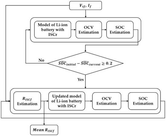 In accordance with the estimated state of charge (SOC) defined as the present capacity of the battery as a proportion of its total capacity, the model of Li-ion battery with ISCr is switched to the updated model of Li-ion battery with ISCr. If the variation between initial estimated SOC and current estimated SOC is ≥0.2, the is estimated. Estimates of fluctuate due to variation in load currents, so as a fault index, the mean of estimated s is used to detect the ISCr instead of the estimated . is calculated from the previous estimated s and the current estimated , then used to change the model with ISCr to the updated model with ISCr. Then, using the updated model improves the accuracy of open circuit voltage (OCV) estimates, so is estimated accurately. Iteratively, the next is calculated using the next estimated and used to update the model again. We call this process the SMM (Figure 1).