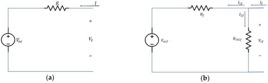 A normal Li-ion battery can be represented by an equivalent circuit model (Figure 2a) [15,17,19] that consists of OCV , internal resistance , load current and terminal voltage . The Li-ion battery with ISCr can be represented by a similar equivalent circuit model (Figure 2b) [15,17,20] where is the current that flows within the battery, and is the current that flows through the .