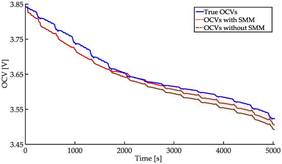 After switching the model, the estimated OCVs with SMM began to be more accurate than the estimated OCVs without SMM (Figure 3) because of elimination of the error from the approximation-assumption. The true OCVs used for verification were calculated using the true value of , the coulomb counting method and the relation between OCV and SOC.