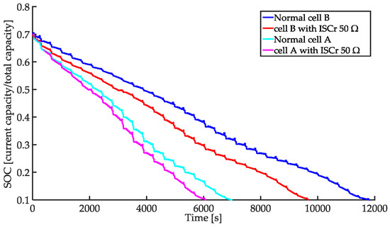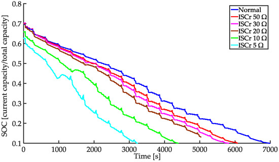 The estimated SOCs can be obtained from the relation between OCV and SOC (Figure 4). Because of additional self-discharge due to flowing through the , the estimated SOCs decline more in the battery with ISCr than in the normal battery. Furthermore, decrease in represents increase in the severity of the ISCr in the Li-ion battery and in the decline of estimated SOCs. Using the self-discharge phenomenon, can be estimated [18].
