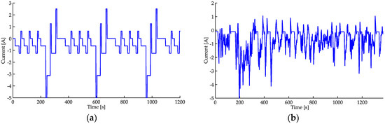 Two load current profiles were used as input data to the simulation and the experiments (Figure 5). We named these current profiles DST 5 A and UDDS 5 A; both have the minimum value of −5 A. We also used both DST 3 A and UDDS 3 A to verify the proposed algorithm with various data.