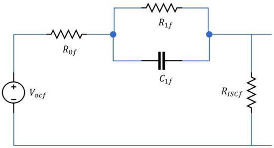 In this study, a first-order RC model [22] was used to build a simulation model. To represent the ISCr, was connected in parallel at the terminal of the first-order RC model (Figure 6). The simulation model was configured using MATLAB/Simulink [23,24]. Resistance , resistance and capacitance (Figure 6) were estimated using the RLS algorithm with experimental data of cell A and DST 5 A [19], then used to build the simulation model.