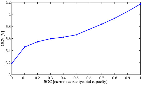 The relation between OCV and SOC was obtained by a prior test [25] and is necessary to use the proposed algorithm. After the battery had been charged fully, it was rested for 3600 s to obtain a value of OCV that is equal to the terminal voltage. Then the battery was discharged with 0.5 C for 720 s to set the SOC to 90%, then rested for 3600 s to get the value of OCV. The OCV-SOC curve (Figure 7) could be obtained by repeating the process until the value of SOC reached 0%.