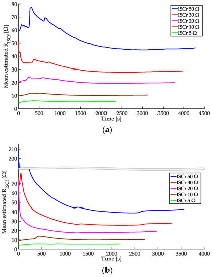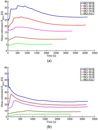 also fluctuated in experimental results but also decreased and converged on values near the true (Figure 10). The main difference between simulation results and experiment results was that the maximum relative error of ISCr 50 Ω and 30 Ω significantly increased from 14.2% in the simulation to 49.3% in cell A (Table 5).