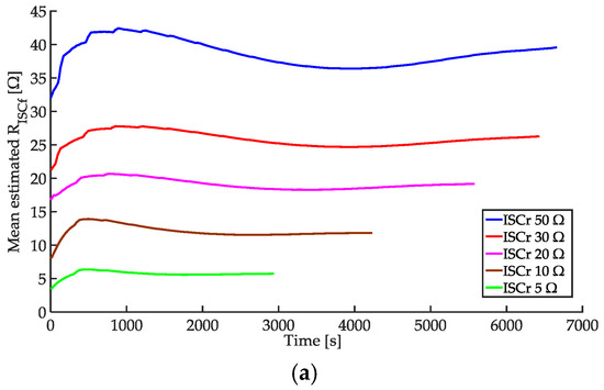 Although the fluctuations were high in the early stage, the magnitude of the fluctuations gradually decreased and s converged on values near the true . The relative error of ISCr 5 Ω and 10 Ω was large although the self-discharge from ISCr 5 Ω and 10 Ω was influential. Because the self-discharge from ISCr 5 Ω and 10 Ω largely increased the decline of SOC in the early stage of interations (Figure 4), the initial estimated SOC had estimation error. This error affected the accuracy of estimates for ISCr 5 Ω and 10 Ω. The final value of had relative error ≤14.2% (Table 4) and the ISCr could be detected early with high accuracy of estimates.