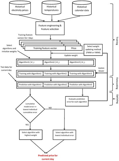 The proposed model for electricity price prediction is presented in Figure 1. We have to recruit prediction algorithms that exhibit promising results when utilized separately to participate in our ensemble model. Here, we show three participating algorithms for demonstration purposes (in theory, any number of different algorithms can be used under this model depending on the processing power and time available). The proposed model performs feature engineering on the price data along with the corresponding temperature and calendar data collected from a de-regulated electricity market, which is followed by feature selection, learning, predicting and model updating steps.
