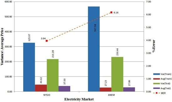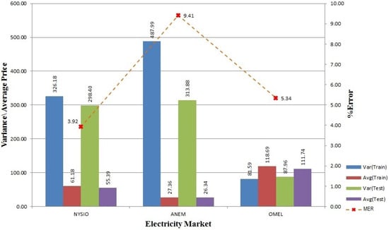 Table 2 shows the MER (Equation (5)), MAE (Equation (5)) and MAPE (Equation (7)) of the four methods for New York (NYISO) data for the testing period of the year 2006. We can see that the results obtained from FWM (VWM in the brackets) have average MER of 3.92% (3.86%) with the SD (Standard Deviation) of 1.03 (1.10), MAE of USD 2.25/MWh (USD 2.20/MWh) with SD of 0.53 (0.52) and MAPE of 3.97% (3.93%) with SD of 0.75 (0.77). The worst month is December 2006, where MER is 5.61% (5.70%), MAE is 3.02 (3.07) and MAPE is 5.46% (5.55%).