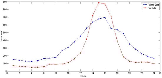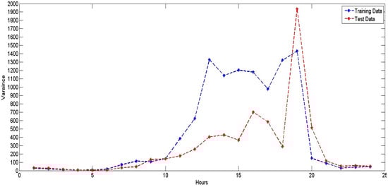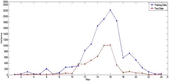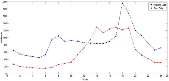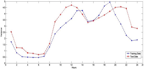 Hourly variance in training and testing data for NYISO (2008–2012).