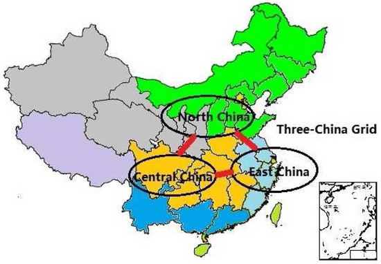 As it is known from TBC applicability analysis in Section 2, the interconnection manner/topology of multi-area systems plays an important role in determining the LFC control mode. With the development of ultra high voltage transmission techniques, the Three-China (“North China-Central China-East China”) synchronous grid is under design for large-scale and high efficiencies of power transmission [8]. The diagram of the Three-China Grid is as shown in Figure 1.