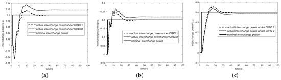 Simulation results in Section 5.1 (Condition (7) holds) and Section 5.2 (Condition (7) does not hold). (a) Interchange power between Areas 1 and 2; (b) interchange power between Areas 2 and 3; and (c) interchange power between Areas 3 and 1.