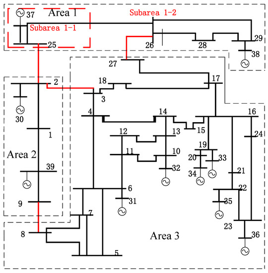 The standard IEEE 39-bus system is adopted to more closely reflect the practical power system [25]. In order to construct the ring network under Circumstance 2, the system is divided into three areas as is shown in Figure 10.