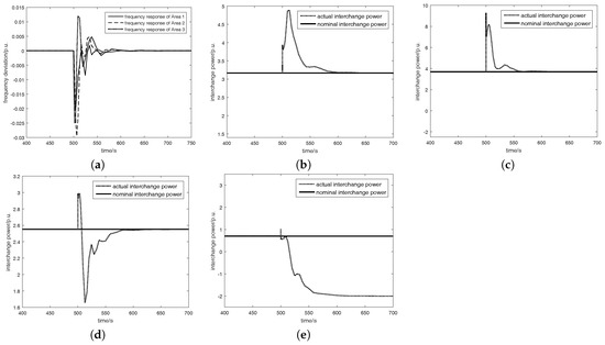 Simulation results in Section 5.3 (Condition (7) does not hold). (a) Frequency response of three areas; (b) interchange power between Areas 1 and 2; (c) interchange power between Areas 2 and 3; (d) interchange power between Areas 3 and 1; and (e) interchange power between two sub-areas in Area 1.
