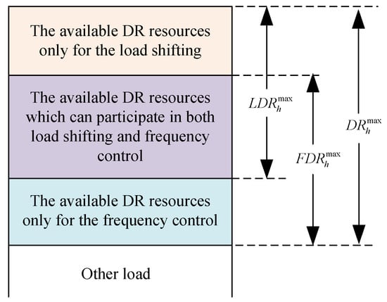 The DR equations are listed in Equations (7)–(10), Equations (7) and (8) define the maximum limits of the dispatched DR for load-shifting and DR for frequency control, respectively. Equation (9) defines the limits of the total amount of dispatched DR for load-shifting and frequency control. Note that frequency-control DR and load-shifting DR are not independent from each other. Some of the DR resources that participate in the load-shifting can at the same time support frequency control. The relationship between the maximum available DR resources and the load-shifting and frequency control is shown in Figure 1.