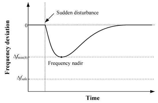To model the frequency limit equation, here we define a safe frequency level Δfsafe, shown in Figure 2. For a supposed contingency (e.g., 10% generation loss or the frailer of the largest generator), the frequency nadir should be above Δfsafe []. The system frequency limit equation is defined in Equation (11).