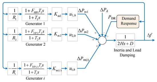 The frequency response model is an effective tool to study the dynamic characteristics of the frequency in response to the time-varying supply or demand. Figure 3 shows a low order frequency response model with multiple generator units. Note that ui,h is the unit commitment (UC) parameter, which was introduced in Section 2. Since this paper focuses on the primary frequency control of the scheduling problem, in Figure 3 each generation unit is equipped with a governor system. Because the response time of secondary frequency control could be a minute or two (much longer than the response time of primary control), the secondary frequency control is not involved in Figure 3.