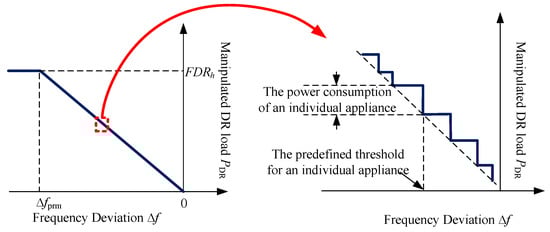Note that the DR may not give a continuous response like Equation (14) because most of the appliances that participate in DR are ON/OFF appliances (i.e., refrigerators, freezers, and water heaters without frequency variation speed control) that can only provide a discrete response. To implement DR with these appliances, a number of frequency thresholds are usually set in advance. If one controller detects ∆f below a predefined threshold ∆fth, the controller outputs a switching signal and switches the appliance off. However, we can define different ∆fth for different appliances properly so that their aggregated frequency response characteristic is similar to Equation (14), as can be seen in Figure 4. The overall control framework can be based on a hierarchical framework [] that combines the centralized and decentralized control framework together. In such a control framework, individual controllers measure the system frequency and compute control signals by themselves; meanwhile, the control parameters are given by the control centre. The response delay is very small and can be neglected []. More details of this DR control strategy can refer [].