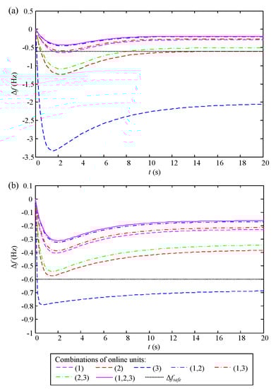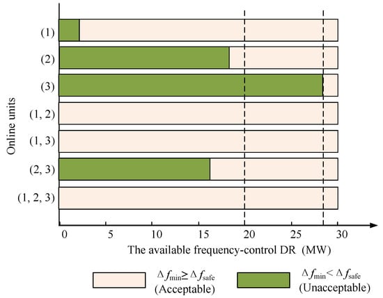 To further show the DR’s contribution to the frequency control, Figure 6 shows the relationship between Δfmin and Δfsafe with different available frequency-control DRs for different combinations of online generation units. It can be seen that, with the increase of the available frequency-control DR resource, the objective of the frequency control can be realized with fewer online generators. When the available frequency-control DR is larger than 28 MW, the Δfmin ≥ Δfsafe can be guaranteed with any combinations of online units.