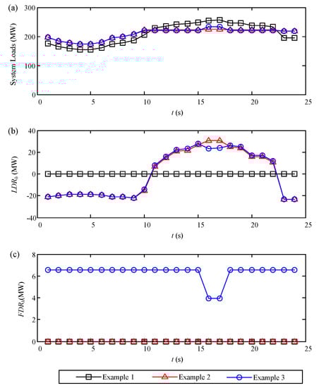 Calculation results of the three examples. (a) System loads; (b) Dispatched DR for the load-shifting; (c) Dispatched DR for the frequency control.
