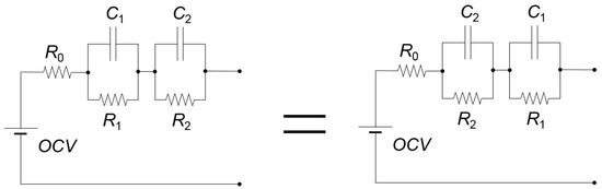 A typical ECM often used in LIB modelling is the second-order resistor–capacitor (RC) network. Swapping the RC pairs of this model, as illustrated in Figure 2, does not affect the output because this model has two possible parameter sets that are interchangeable. It is generally accepted that the midfrequency RC pair (e.g., R1C1) represents the faradic charge transfer resistance and its relative double layer capacitance at the electrode/electrolyte interface, and the high-frequency pair (e.g., R2C2) represents the solid-state interface layer on the active electrode material [19,20,21]. However, without this additional information about the relative size of the RC pairs, it would not be possible to assign physical phenomena to a two-RC network. During usage, LIBs degrade, and key characteristics such as impedance increase due to ageing mechanisms (e.g., solid electrolyte interphase (SEI) layer growth) [22,23,24]. It is desired for the BMS to monitor these alterations to battery dynamics. It is therefore very difficult to track the evolution of each RC pair if they can switch for every estimation.