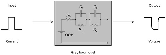 Given a model circuit diagram, it is possible to describe mathematically the exact relationship between the input and the output of the model. As this relationship depends on the model structure (i.e., the circuit diagram), it is simply referred to as the input/output structure. As discussed previously, there are unknown model parameters in this relationship that need to be estimated from empirical data. Given an input/output structure and some proposed experiments to collect data for parameter estimation, structural identifiability analysis considers the uniqueness of the unknown model parameters. It is a purely theoretical method that assumes the data is perfect and noise-free [28,29]. This is an important, but often overlooked, theoretical prerequisite to experiment design, system identification, and parameter estimation, since numerical estimates for unidentifiable parameters are effectively meaningless; unidentifiable parameters have an infinite number of possible numerical solutions. If parameter estimates are to be used to inform about charging and discharging strategies, or other critical decisions, then it is essential that the parameters be uniquely identifiable. Parameter-fitting software packages generally struggle when attempting to estimate nonidentifiable parameters; numerical optimisation algorithms may oscillate between numerous possible solutions, considerably reducing the confidence in the accuracy of the parameter values.