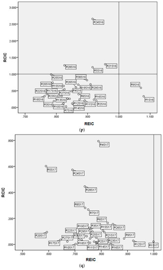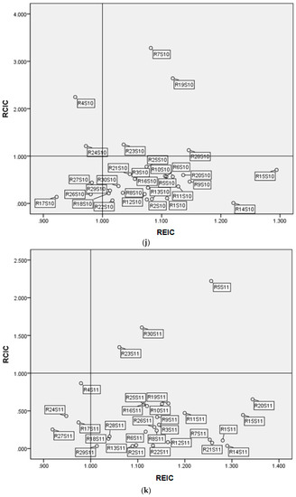 Figure 2c represents the LL-type regions, which include Hunan (R18), Shanxi (R4), Sichuan (R23), Xinjiang (R30), Shaanxi (R26), Gansu (R27), Chongqing (R22), Hubei (R17), Hainan (R21), Fujian (R13), and Heilongjiang (R8). For the LL-type regions, both the and the are lower than 1. Similar to the LH-type regions, most of the LL-type regions are located in the inland area, where it is difficult to attract capital such as foreign direct investment (FDI) and excellent human resources. In these regions, the light industry sectors have had a relatively better economic effect.