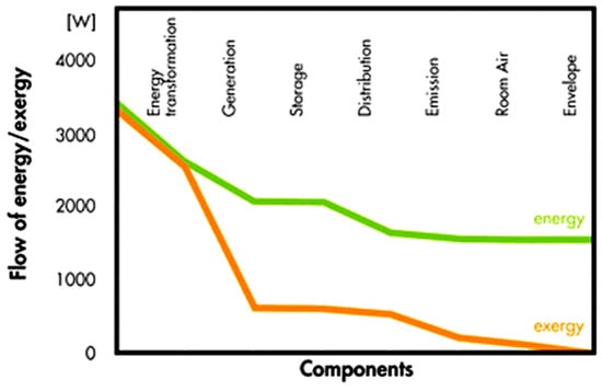 Exergy analysis represents an established technique in the process optimization of many engineering fields, for example of thermal power plants, and as thoroughly explained in the IEA Annex 49 report [], it is a potentially useful technique to also promote a more rational use of energy resources in the built environment. The quality of the energy contained in a comfortable room is fairly low, because the indoor temperatures are around 20 C, which corresponds to a quality factor of 7% if the reference temperature is 0 C. However, in this case, the overall energy demand of the building is often satisfied with a much higher quality source of energy supply.