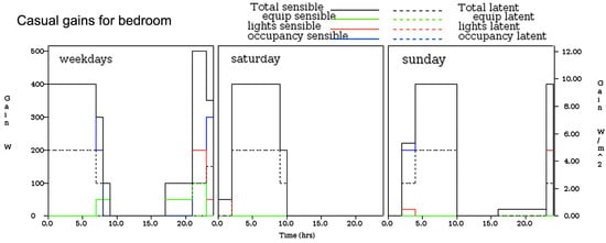 The case study is a typical residential building in the countryside near Rome; a standard geometry and a set of ordinary casual gains are modelled with the ESP-r dynamic software (Figure 4). Since the attention is on the design process, the particular case is not significant. The east facade selected for the exergy analysis is highlighted in Figure 5, and the casual heat gains for both thermal zones are reported in Figure 6 and Figure 7. The building has a surface-volume ratio of 0.64; the outside surface area is 263.4 m, 53% of which is vertical; and the volume is 411 m.