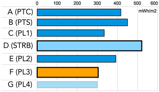 In this simplified case, the objective Function (11) is calculated for a significant sample of the seven envelopes, located at the east wall of the living room, where the most critical temperatures are reached during the typical hot day. The objective Function (11) is used as a ranking criteria because the aim of the second design step, the focus of this investigation as described in Section 2.2.2, is the maximisation of the useful exergy extraction from the environment.