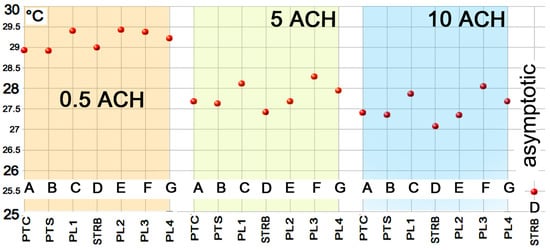 In this research, the constant value  = 26 C is therefore used as the reference temperature. Pons [] suggests the use of the “most favourable” temperature for the considered process that is available in the surrounding environment. For a standard cooling system, the most favourable choice would be the minimum value of the ambient air temperature  in the assessed period (). However, the aim is to minimise the envelope exergy demand and consequently to maximise exergy harvesting from the environment whenever possible.