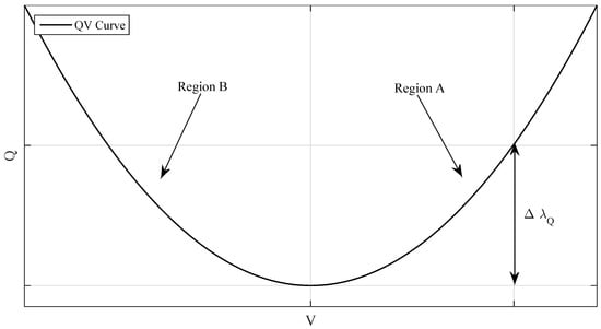 The first step in planning a restoration procedure is a static analysis, where the power flow is calculated, and violations are pointed out. During this stage, voltage stability tools are used to infer power system stability conditions, establishing boundaries between safe and unsafe regions. A power system is considered voltage stable when it is capable of keeping the voltage profile steady after being subjected to a disturbance. In this sense, the system is voltage stable when control actions produce coherent results. Otherwise, when reverse results are observed, the system is considered unstable. Figure 1 depicts such a situation with the help of a QV curve, that shows the voltage sensitivity to variations in reactive power injection. Region A identifies voltage Stable Equilibrium Points (SEPs) for a particular load bus, where an increase in the reactive power injection is associated with a voltage magnitude increase [25], i.e., . The contrary occurs in Region B, which is related to Unstable Equilibrium Points (UEPs) and . stands for the reactive power margin. The basics behind the QV curve are found in [26,27].