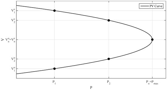 Figure 2 depicts the voltage stability problem in a PV curve [26] that relates voltage magnitude variation in function of load increase. The upper part is the stable region, associated with SEPs. The lower part is the unstable or abnormal region, associated with UEPs, and is avoided during operation. As the system moves toward the maximum loading point , the stable solution and a particular unstable solution get closer until they merge into one on a saddle node point, and no further solutions are possible.