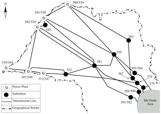 The real case power system selected is a part of the São Paulo State power system in Brazil, which has a 440 kV bulk connected to 345 kV and 230 kV branches and local loads as in Figure 3, covering 248,209 km2.