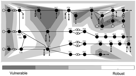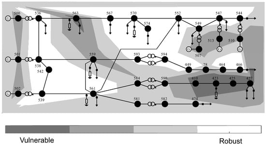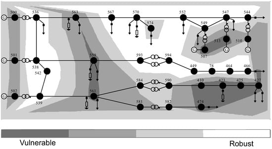 The base case scenario, presented in Figure 4, is the schematic diagram of the studied power system using the result of each bus robustness level as background. The is presented in Table A1 in the right-hand side column.