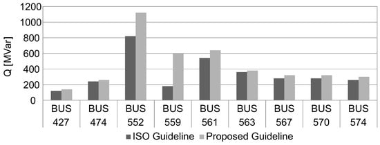 The second comparison relates to the reactive power load margin yielded by the QV curve, which measures the capability of each bus in providing reactive power. The calculation of this voltage stability index is obtained by increasing the reactive power only in the bus of interest until the system reaches the voltage collapse. The proposed guideline provides a larger reactive power load margin for the majority of the buses considered, as shown in Figure 7. Bearing in mind that voltage stability issues are strongly associated with reactive power availability [36], the proposed solution presents a well-conditioned transmission network, which is able to supply all system loads with a security margin considerably higher than the proposed standard solution.