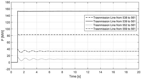 The simulation results are shown in Figure 8, which shows the active power flowing in the connected transmission lines. Note that the methodology proposed in this paper yields a smaller active power flow in transient and steady-state conditions, rendering this technique more effective for this purpose, since lower impacts are observed. In the sequence, another dynamic event is considered. Under normal system operation, short-circuits are considered the main source of disturbance in dynamic stability study. In restoration study, short-circuits are rarely considered, since it is more realistic to consider load pick-ups, load shedding, and tripping off transmission lines.