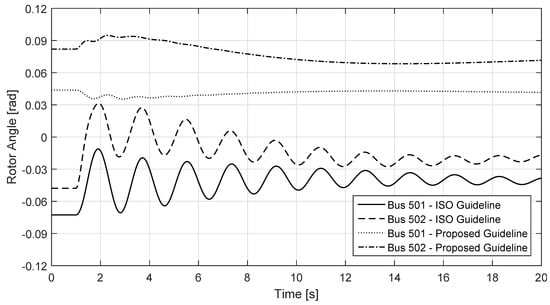 The event considered is a full load shedding at bus 561, which is a severe event and is likely to occur to recently connected loads during Power System Restoration (PSR) due to inappropriate protective actions during grid instabilities [11]—for instance: voltage sags or sudden load variations. The results obtained from both solutions are transient stable and dynamic stable, as demonstrated by the rotor angle in relation to the system mass center, depicted in Figure 9. The proposed solution, however, presents smoother behaviour and smaller angular deviation in relation to the ISO guideline solution, indicating that the angular stability is improved.