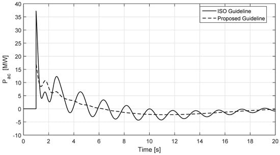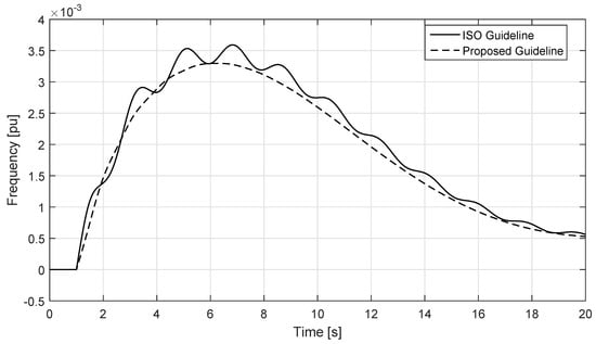 Two main differences are shown for the response: maximum peak and oscillatory response. The maximum peak after the event is 37 MW for the ISO guideline, whereas, under the methodology proposed using the RA tool, the initial is 17 MW. Sudden power mismatch of the generator unities induces torque variation on the generator-turbine shaft, reducing its life-cycle. Consequently, solutions that present smaller power variations are preferable, as the proposed guideline for this scenario. The second divergence between the two guidelines is the oscillatory response presented by the ISO guideline leading to angle excursions and torque variations.