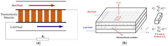 According to the different flow directions of the hot and cold fluid, there are two typical modes exist in the TEG system, namely, parallel flow mode and counter flow mode. These two modes are completely symmetrical in structure and perform under the same mechanism. Thus, only a parallel flow heat exchanger, namely, flow directions of exhaust and coolant are the same, is adopted for the TEG system in this study. The schematic of the TEG system is presented in Figure 1a, and the mathematical model for the TEG system is shown in Figure 1b. All the TEMs are divided into nx × ny computation units, and each unit is a P-N junction. The direction of fluid is defined as x direction, and along this direction there are nx rows, which are marked by i (i = 1, 2, …, nx). Similarly, the perpendicular direction is defined as y, and there are ny columns that are marked by j (i = 1, 2, …, ny). A coordinate plane is formed based on the row and column number and the coordinate of computing unit can be represented as (i, j).