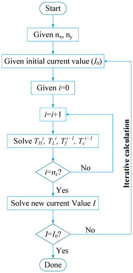 As can be seen in Equation (13), the current I was determined by the whole temperature distribution on the TEG system. Meanwhile, the temperature distribution was also affected by the current I. As can be seen in Equations (1) and (2), the current I, cold side temperature of TEMs and hot side temperature of TEMs coexist. Therefore, there is a coupled relationship between the temperature and the electric field. Since the temperature distribution of TEMs coupled with the circuit current, the iterative method presented in Figure 2 is applied to solve the governing equations, at the beginning, the number of rows along x direction nx and number of columns along y direction ny are prescribed. Then, initial current value I0 is given to solve the temperature distribution of the TEG system. According to the calculated temperature field, a new current I can be obtained and this new current I will be compared with the initial current I0. If these two value are not consistent, the new current I is set as the initial current I0 for the iterative calculation until the two values are consistent.