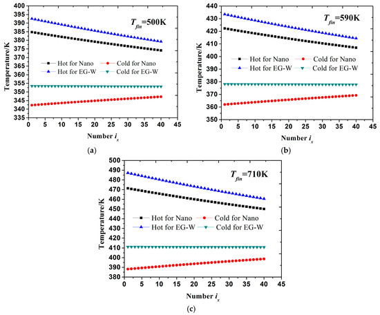 Hot side and cold side temperature distributions of TEMs for two coolants (Cu-EG nanofluid and EG-W) are obtained under different inlet temperatures of exhaust (). Along the fluid direction, temperature distributions of TEMs for the case of = 500 K, 590 K, and 710 K are presented in Figure 3a–c, respectively. As indicated in the figures, the hot side temperature of the TEMs naturally decreases slowly for both coolants, due to the heat transfer process between exhaust and hot side of the TEMs. Likewise, cold side temperature of the TEMs increases gently.